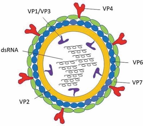 Triple‑layered, non‑enveloped, icosahedral virion with 11 dsRNA segments. Inner core (VP1 RNA‑dependent RNA polymerase, VP3 capping enzyme, enclosed by VP2), intermediate capsid (VP6 trimers), and outer layer (VP7 + spike protein VP4). VP4 is cleaved to VP8* and VP5* to mediate attachment/entry.
